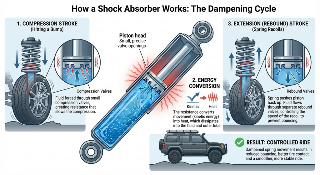 Imagine your car hits a bump. The shock absorber compresses, then quickly returns to its normal position. Inside the shock, a piston moves up and down through hydraulic fluid. This fluid is forced through tiny holes in the piston, creating resistance. That resistance is what smooths out the ride.